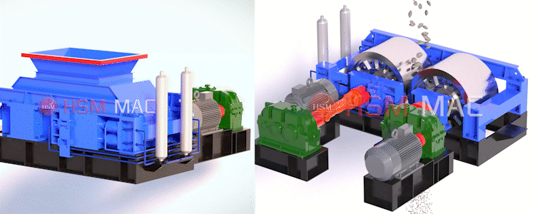 中型对辊破碎机是利用两组单独传动的辊轴,相对旋转产生的挤轧和磨剪力来破碎物料。物料经给料口落入两辊之间,经对辊挤压破碎之后成品自然落下,当遇到过硬或者不可破碎的物料时,辊子可凭液压缸或弹簧的作用自动退让,使双辊之间的间隙增大,过硬或不可破碎的物料自然落下,以此来保证机器不被损坏,相向转动的两个辊子可以调节液压缸或弹簧的压力来控制产品的出料粒度。